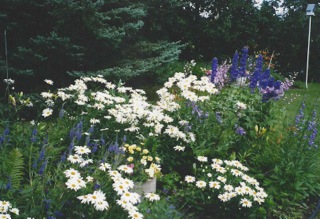 The earlier mentioned house has a subtle elegance to it. It is one of the first that was built along the river, standing tall at two stories. There are two French doors that open up onto a second floor balcony. On the main floor there is a large bay window that looks into a kitchen. Underneath the second floor balcony is a patio with flower pots, chairs, a table and barbeque grill. Ivy grows up rod iron pillars to the second story. The house is white, with blue trim around the windows sills and door frames. A white picket fence runs the length of yard and encloses the sanctuary. The large evergreens at the corners of the property protect the owners’ from gusting winds – and in winter, blustering snow drifts.