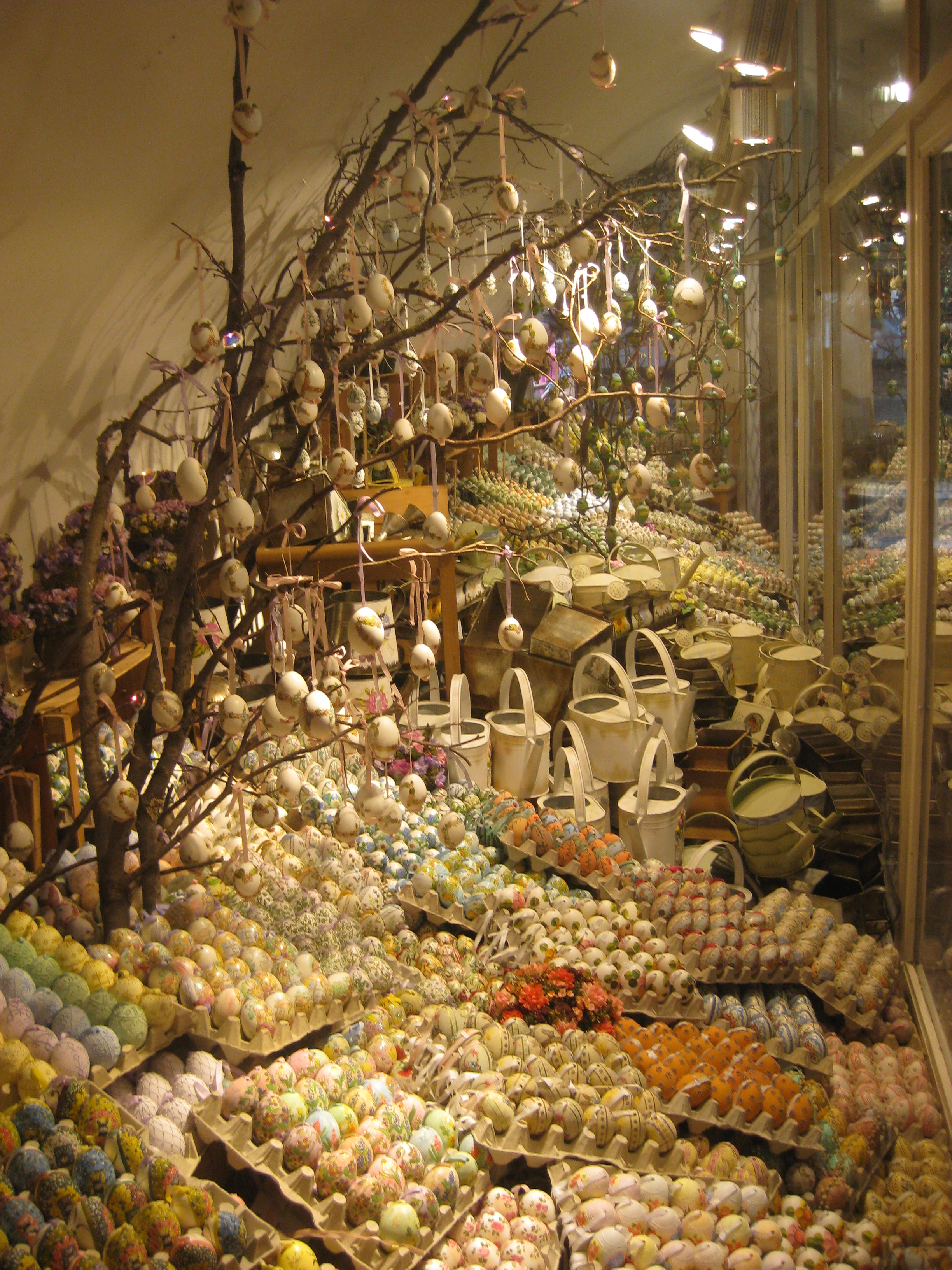 Outside the Palaces and churches into the tightly woven streets, restaurants and shops are jam-packed into every nook and cranny. The Salzach River which runs through the city and heads north to the German foothills and Alps add to its enchantment. I took Cait one afternoon to one of the many little shops; a store dedicated to Easter eggs. The shop was overrun with thousands of hand painted eggs and various decorations. I couldn’t resist and like my Opa did for my Oma, I purchased a couple of pink and baby blue eggs wrapped in ‘raincoat yellow’ ribbon. She smiled and standing on her tip toes kissed my chin.